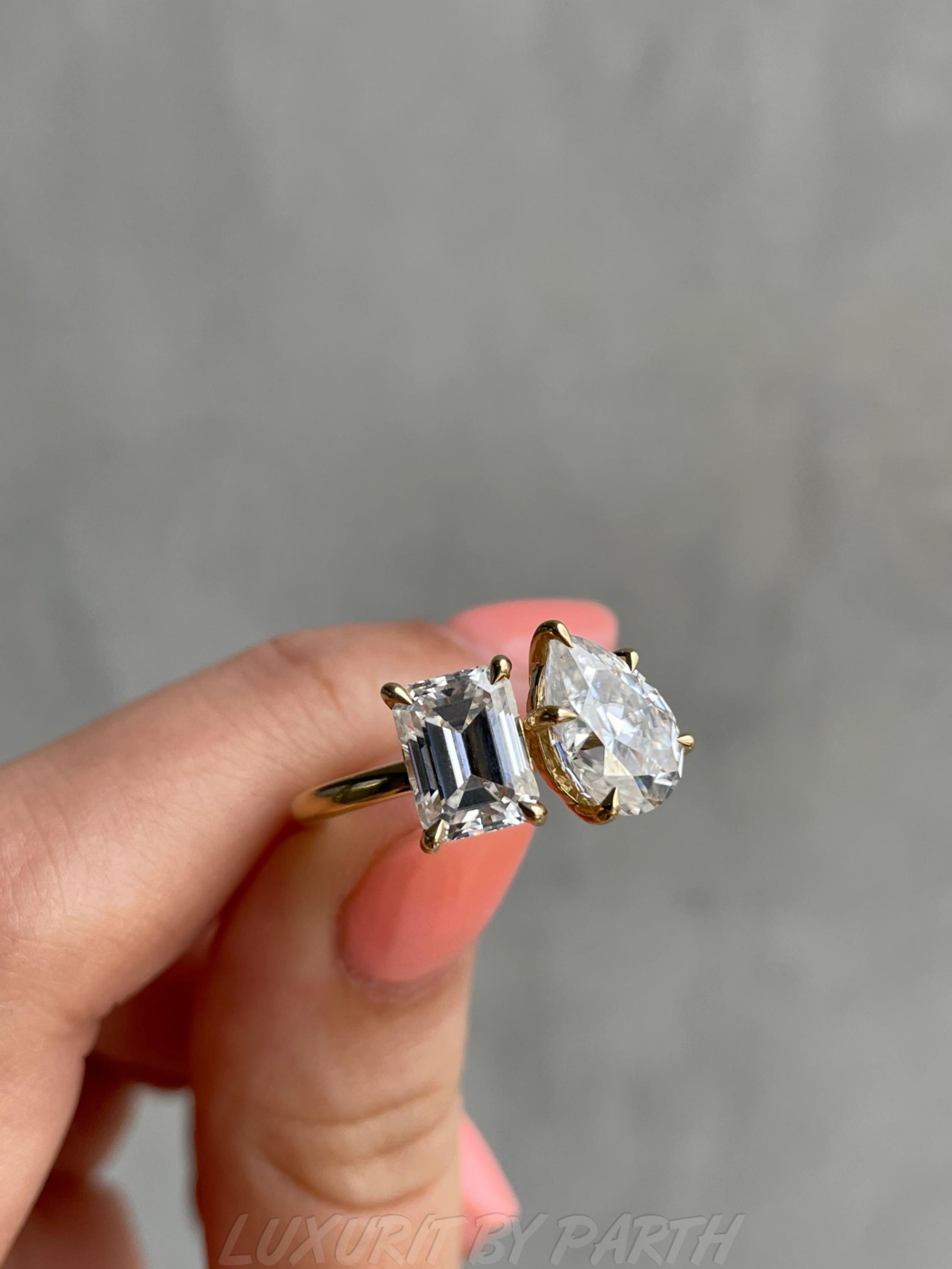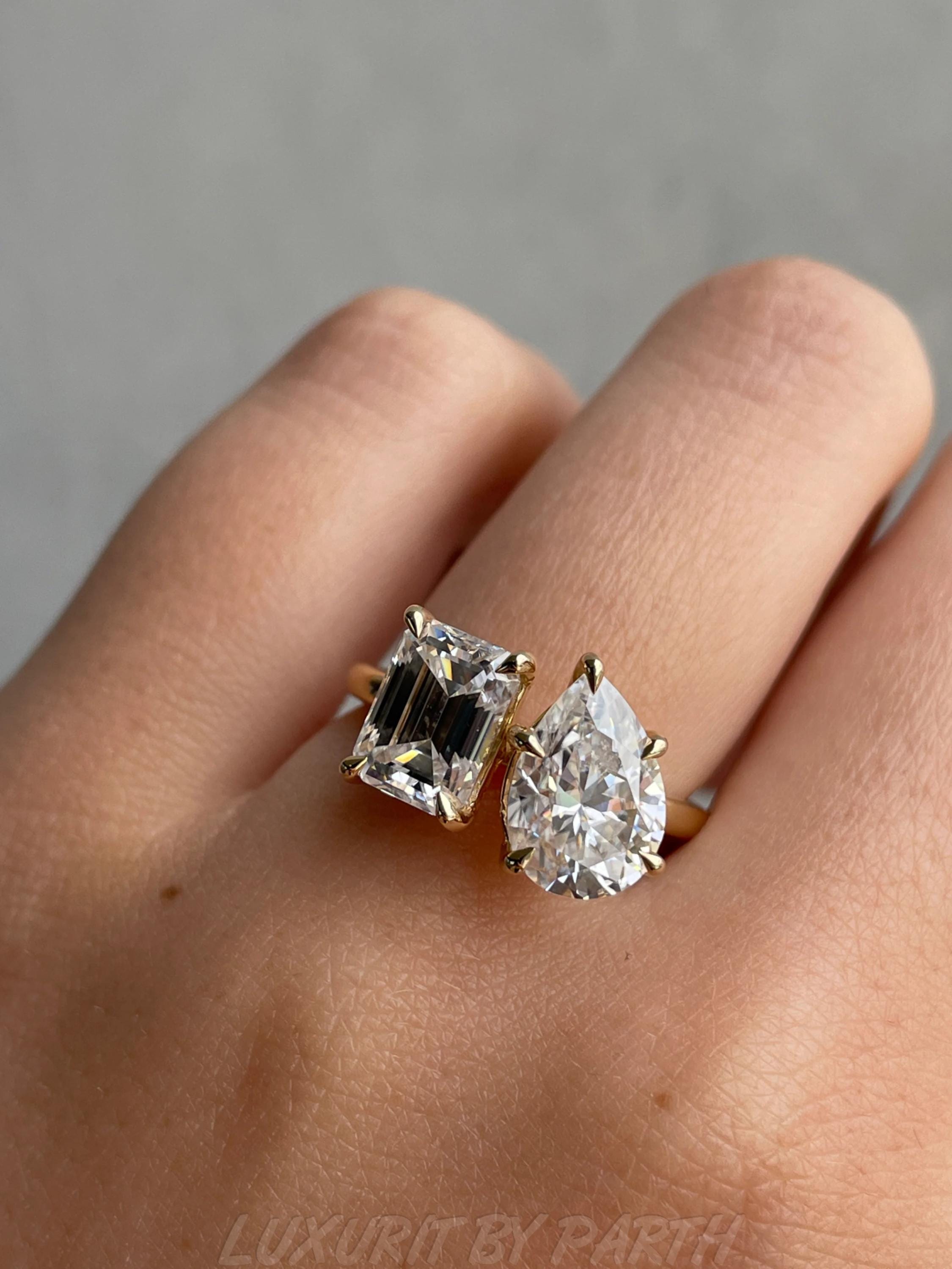 4 CT Emerald & Pear Moissanite Engagement Ring / 14K Solid Gold Double Stone Ring / Toi et Moi Ring for Women / two stone ring