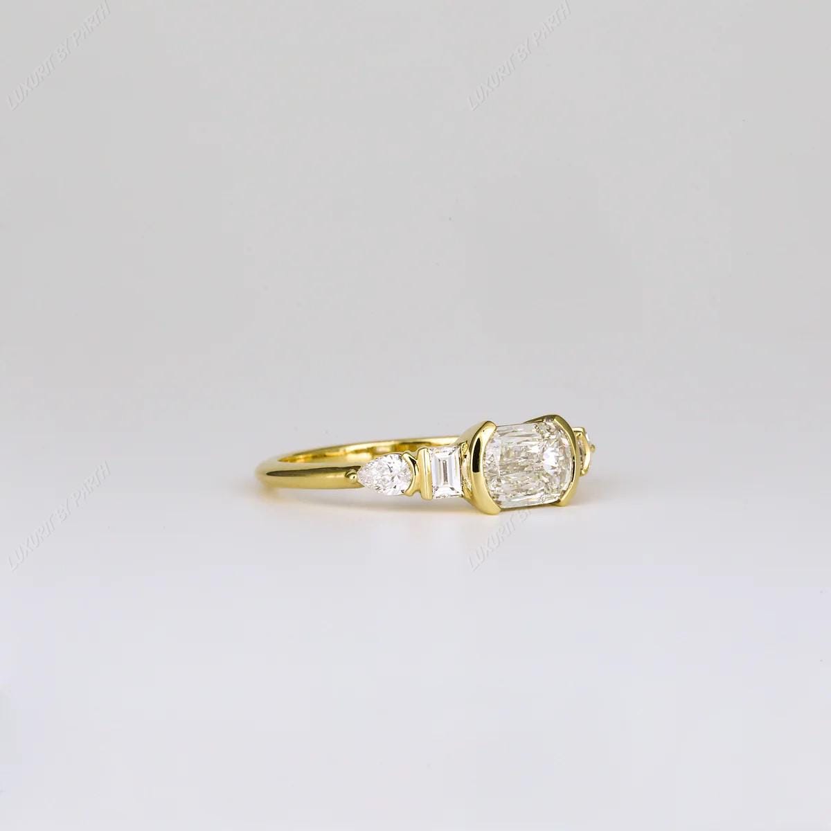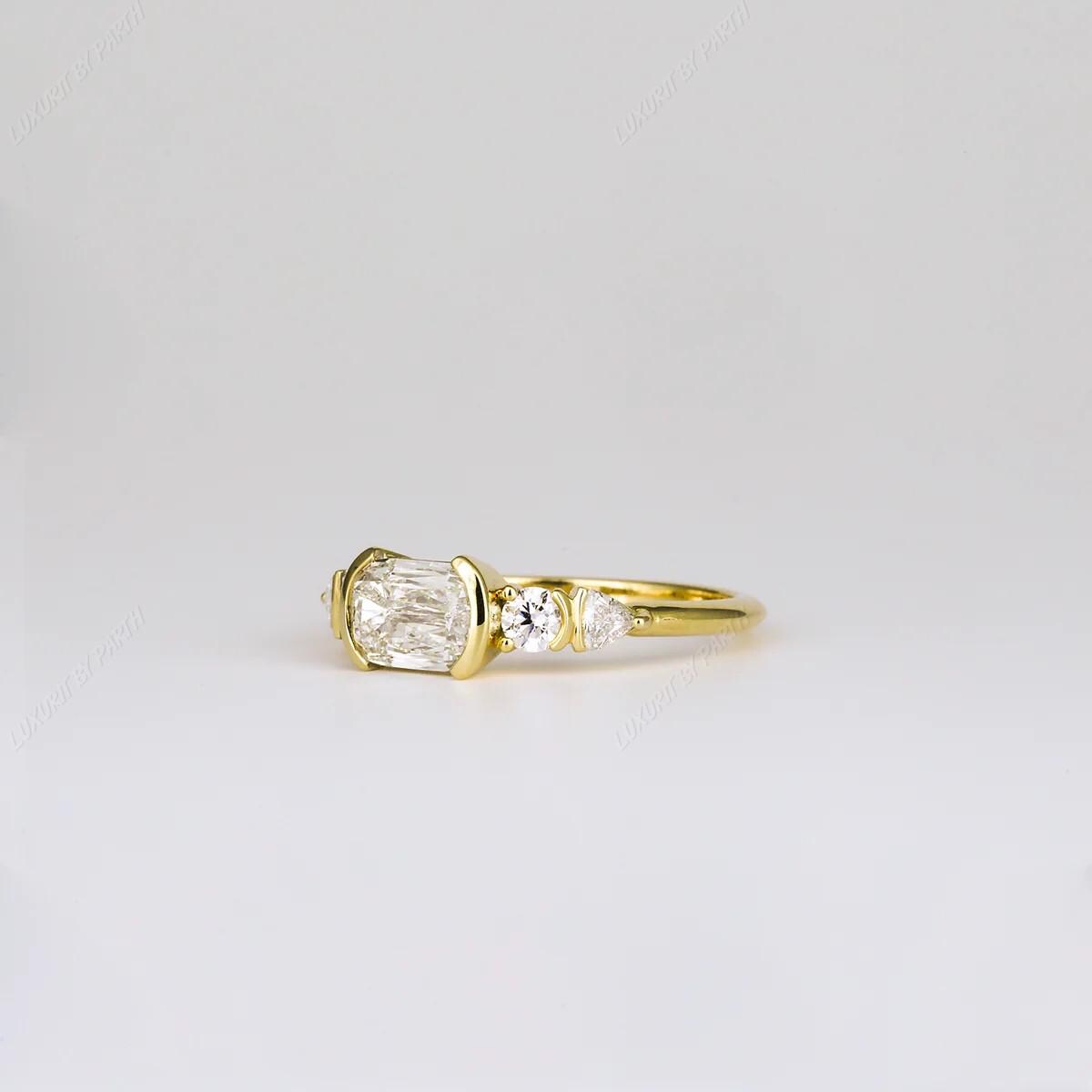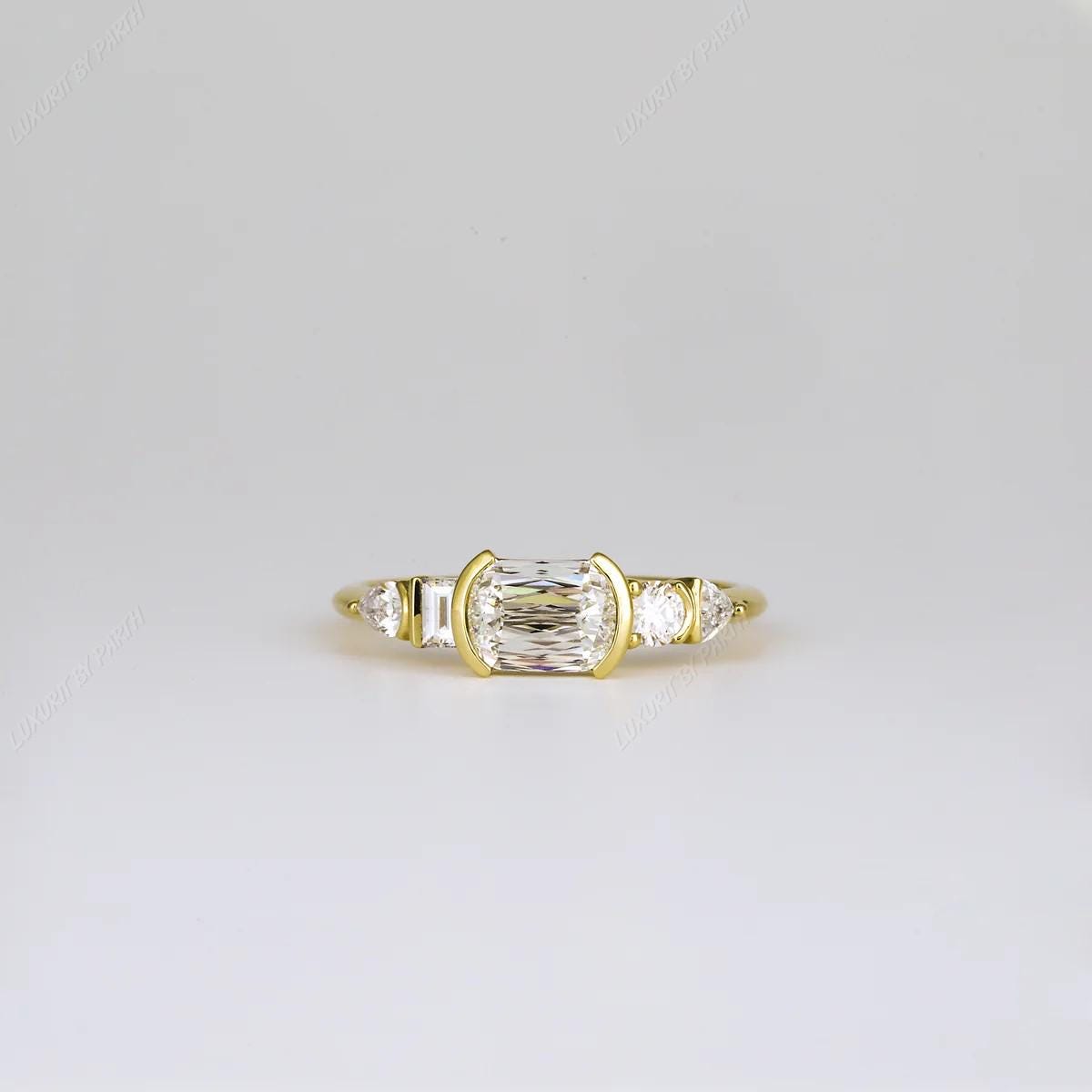 An elongated cushion/scissor cut Moissanite diamond, set east-west in a semi bezel and framed by four asymmetrical diamonds. Set in 18k yellow gold on a signature Luxurit by Parth band.