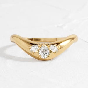 A beautiful, oval cut, Diamond or gemstone is wrapped in warm 14K gold and rests atop your choice of a hand carved, organic gold band or a smooth and sleek gold band.
