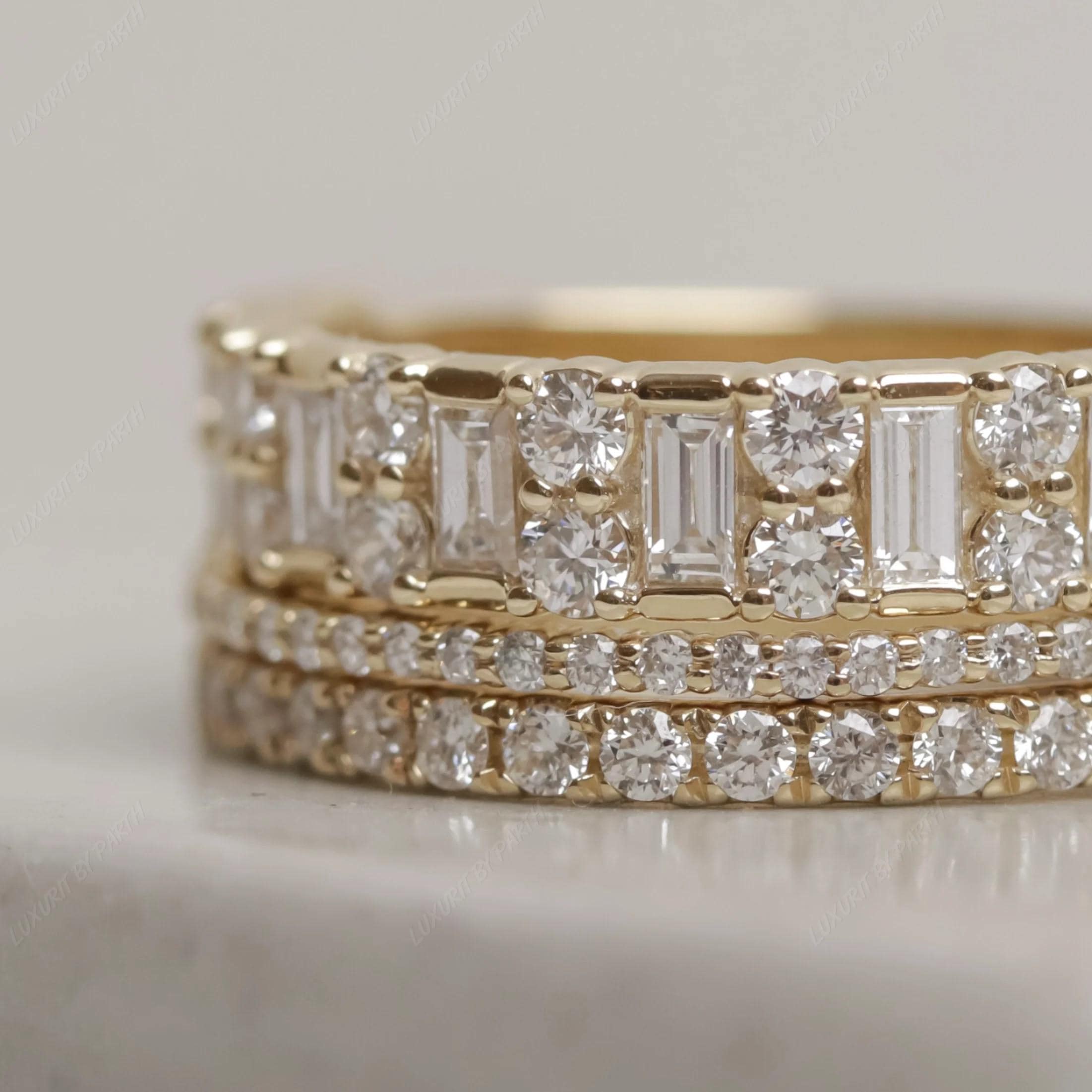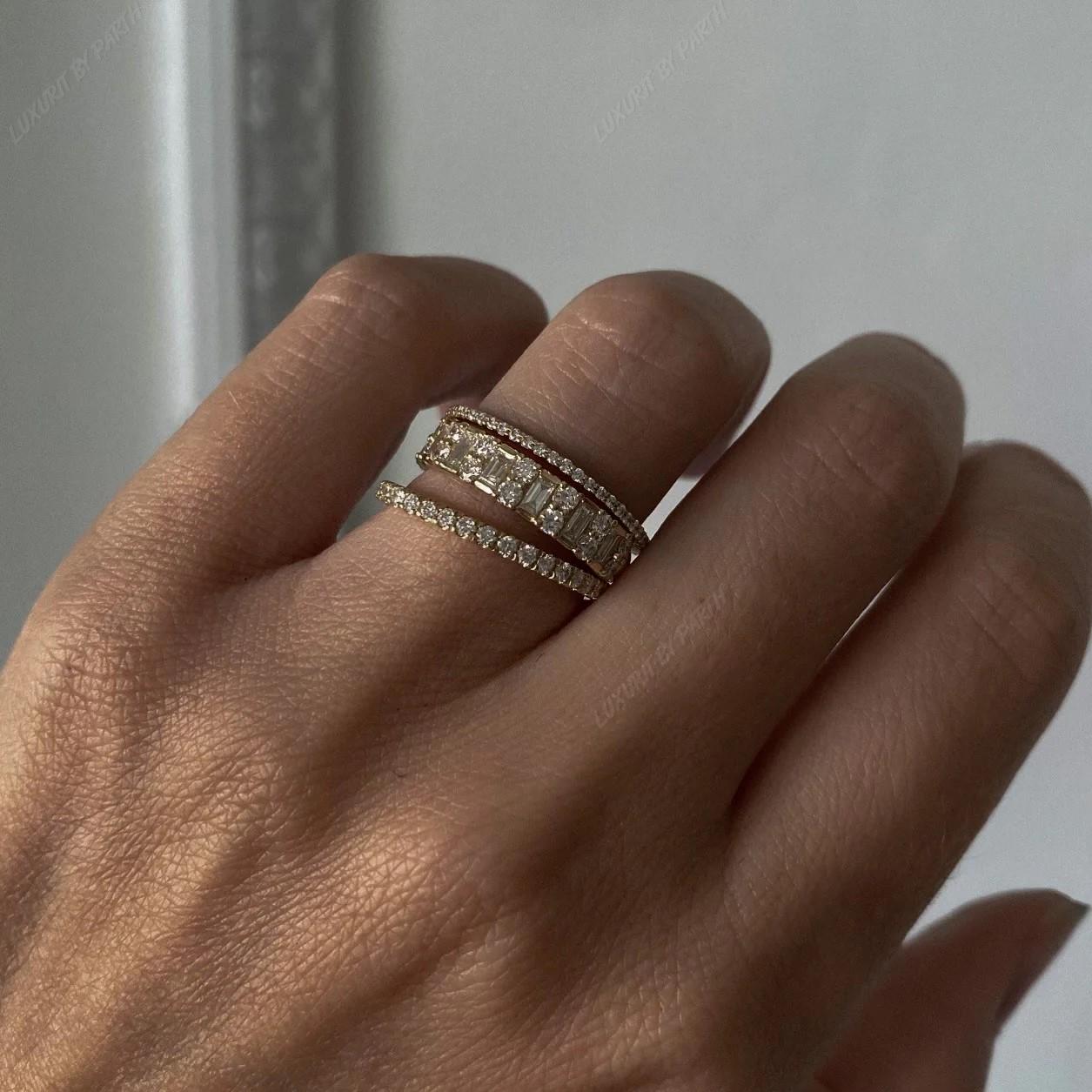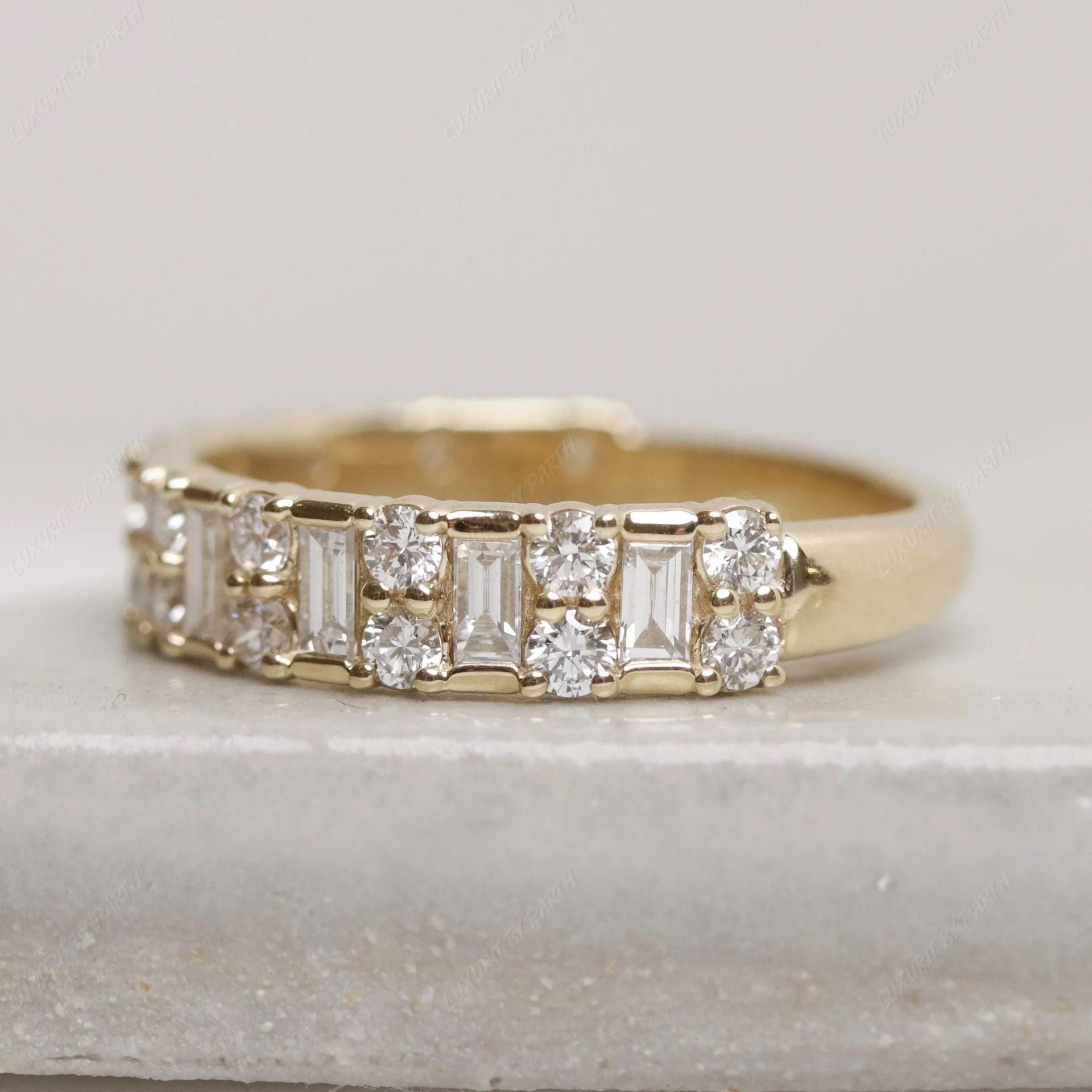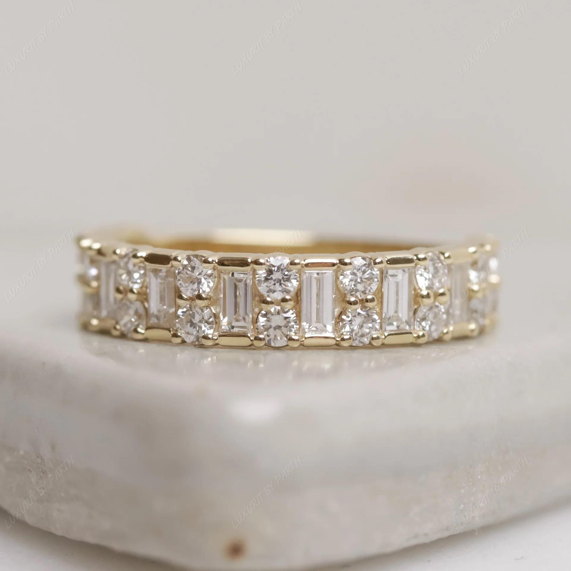 14k Gold Moissanite Ring: Baguette & Round Stone Stackable Band