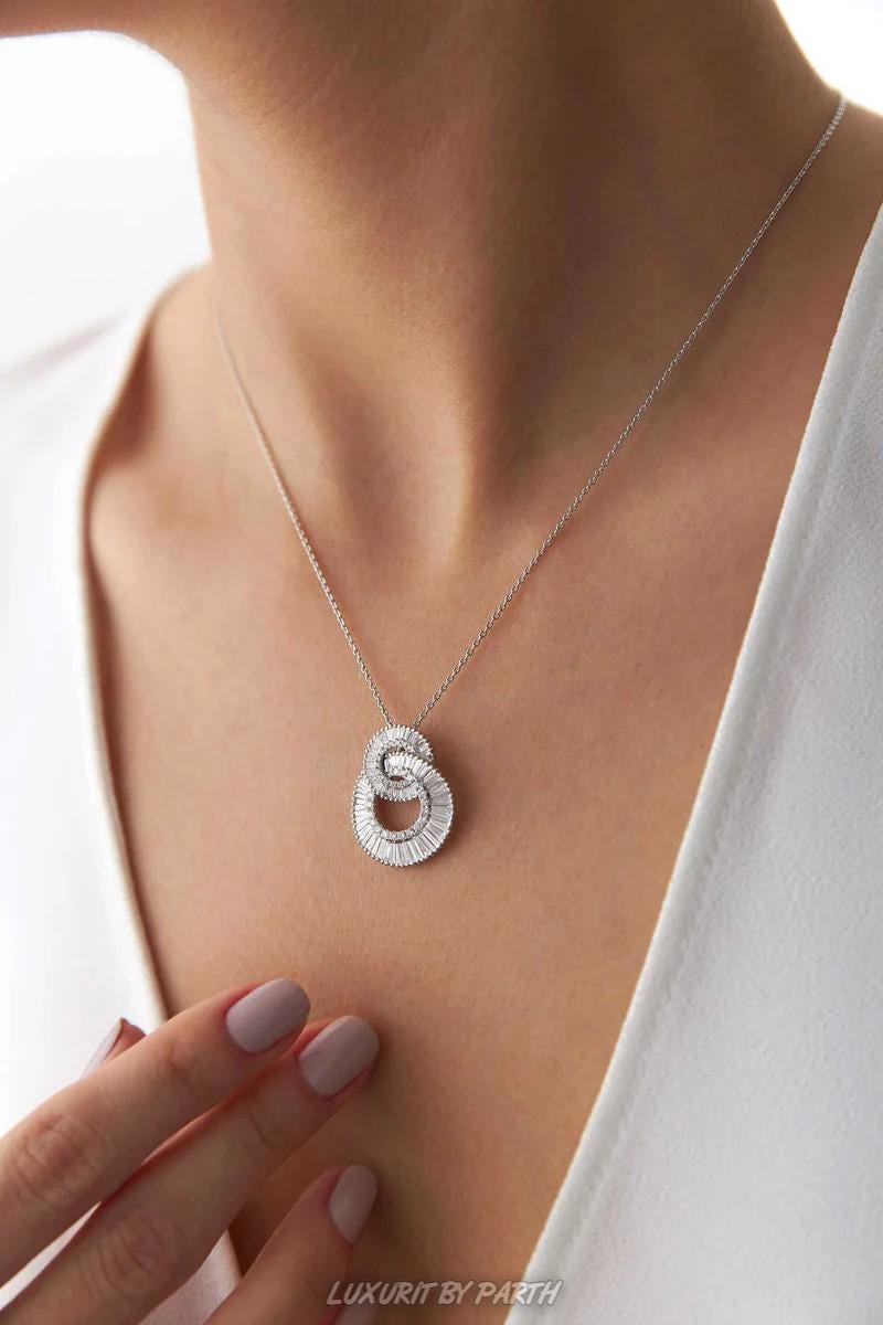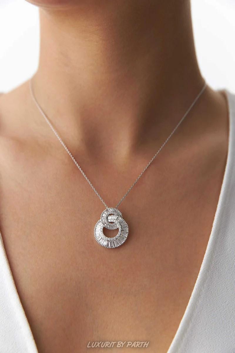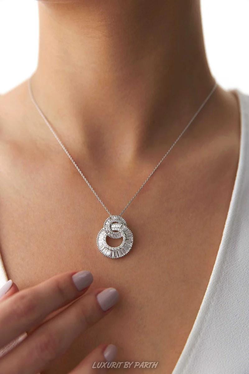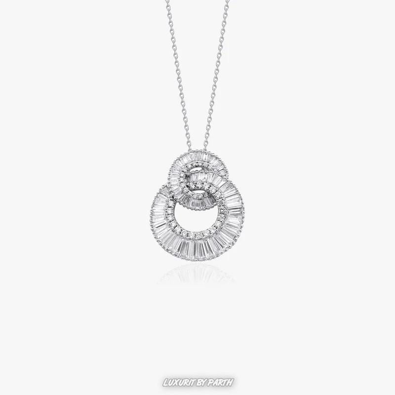 Our new eternal interlocking circle design crafted with Moissanite baguette and round cut diamonds Pendant Necklace to symbolize the immortal bonds you have to your loved one.