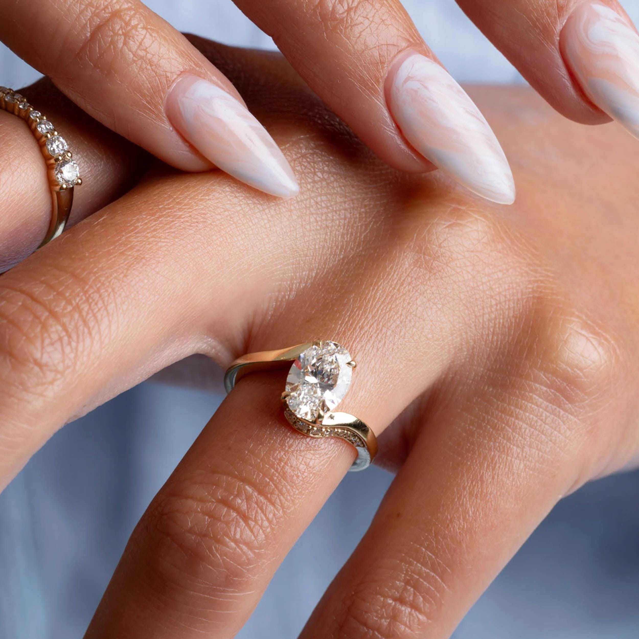 Oval Engagement Ring: 14K Yellow Gold Moissanite Diamond Bypass Solitaire Ring